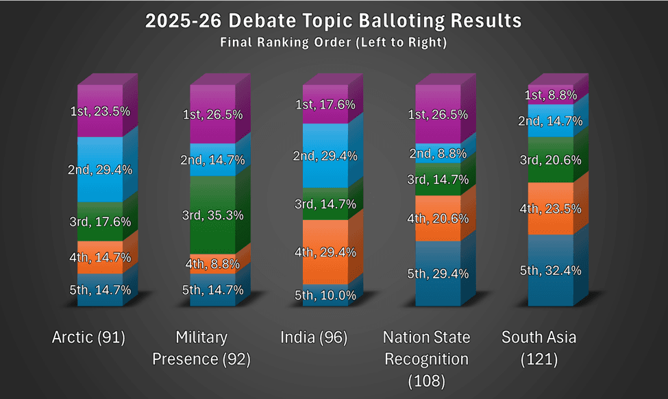The two topic areas receiving the lowest total ranking scores were “Arctic” and “Military Presence.”  These two topics will be placed on a final ballot, which will be sent to states and partner organizations for a final vote.  On January 10, 2025, the NFHS will announce the preferred topic area and resolution, and the 2025-2026 national high school debate topic and resolution will be posted on the NFHS Speech and Debate webpage and sent to state associations and affiliate members.